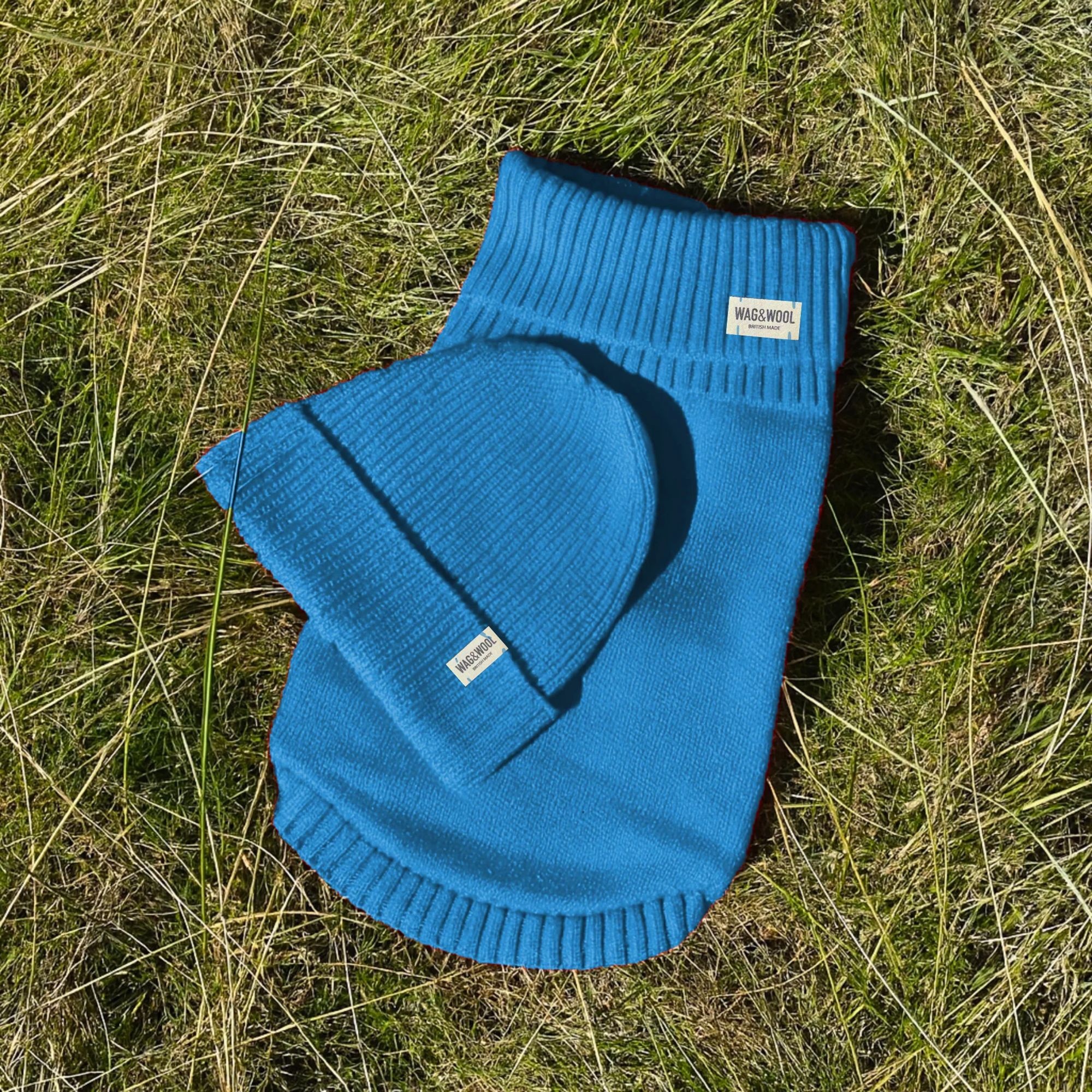 Cerulean Blue British Wool Dog Jumper and Matching Beanie Hat Set