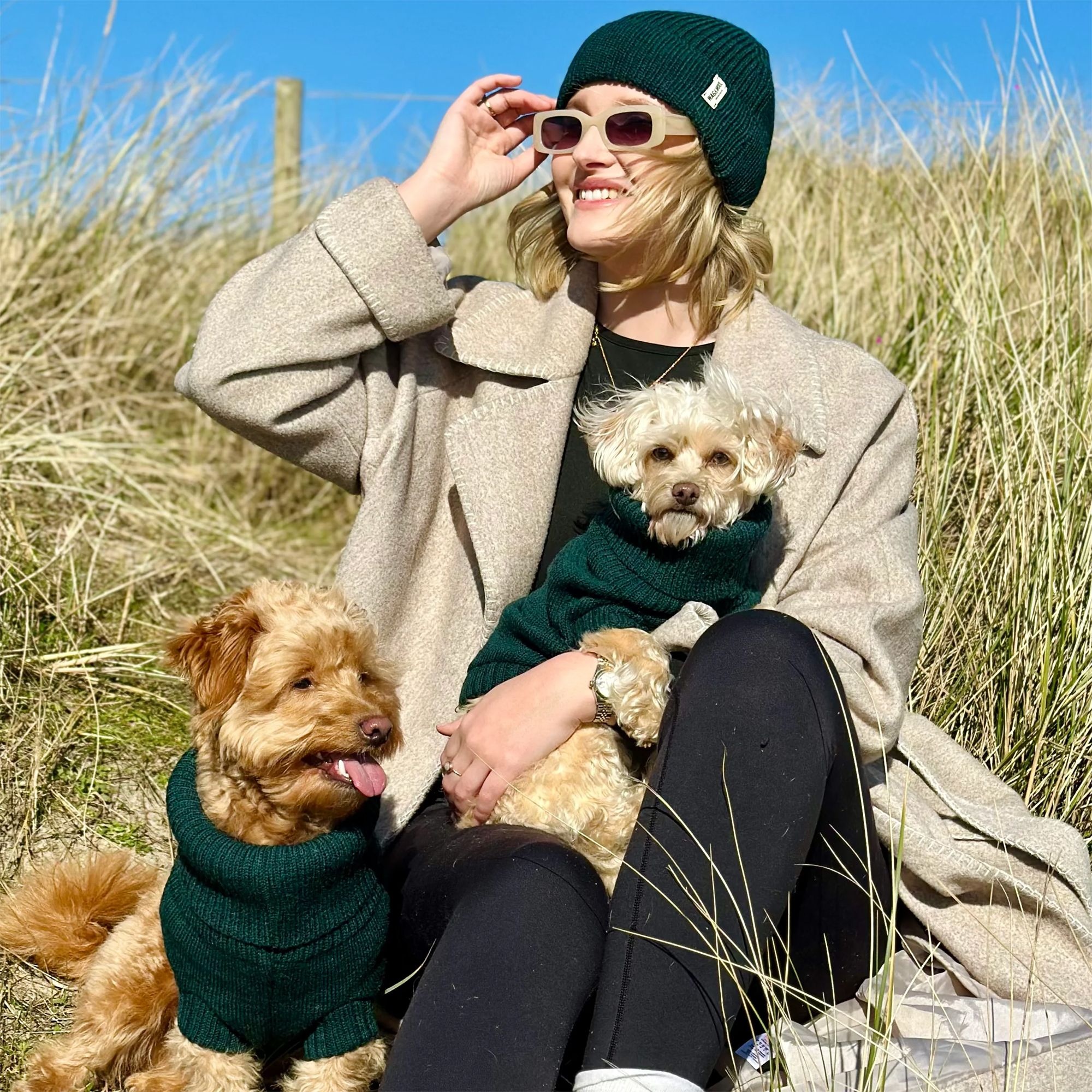 This gorgeous British wool dog jumper and beanie hat set from Wag & Wool will keep you both warm and cosy through the colder seasons. This lovely set includes a super cute dog jumper for your pup and a matching woolly hat for you! Designed and knitted in the UK from pure British wool, both pieces are soft, warm, and oh-so-comfortable. Whether you’re heading out for a chilly walk or posing for a cute photo together, this matching look is guaranteed to turn heads and tails! It’s the pawfect gift for dog lovers or a little treat for you and your pooch. Styled in gorgeous Forest Green.