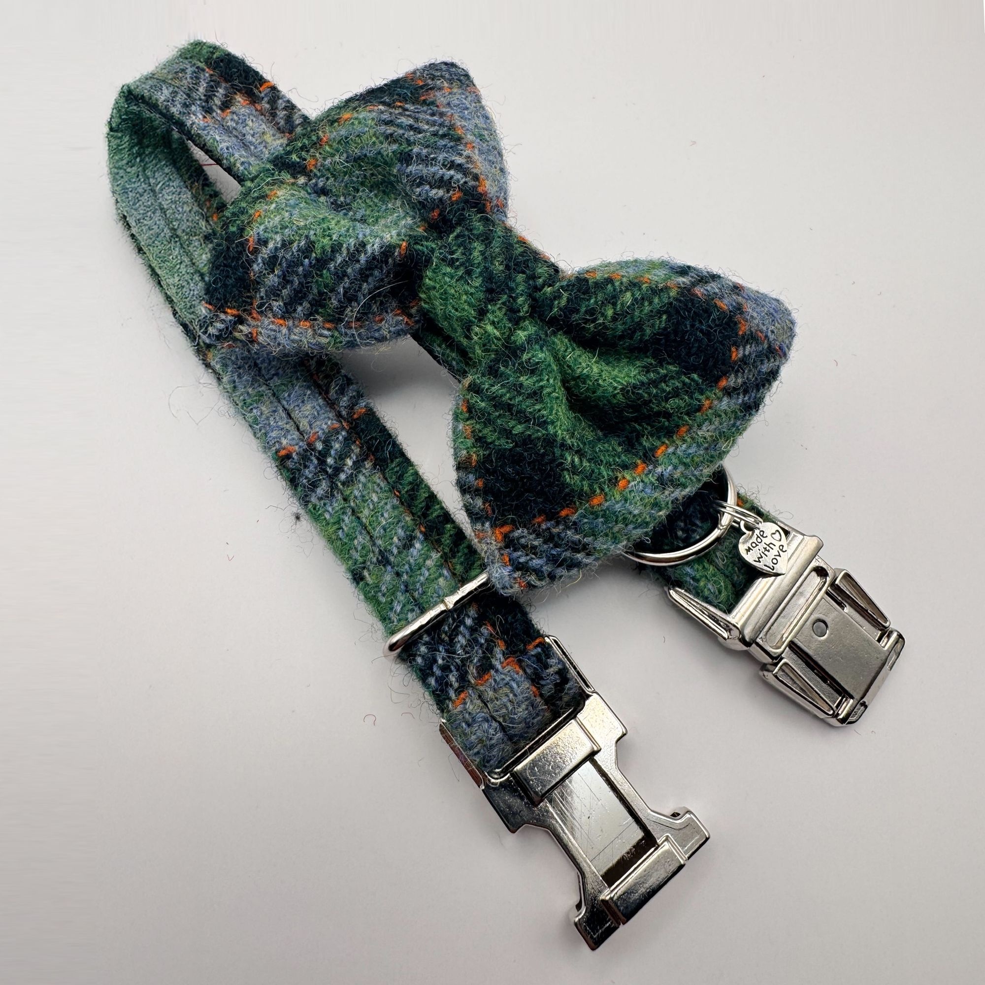 Channel Scotland’s rich heritage with this grass green check Harris Tweed bow tie dog collar.