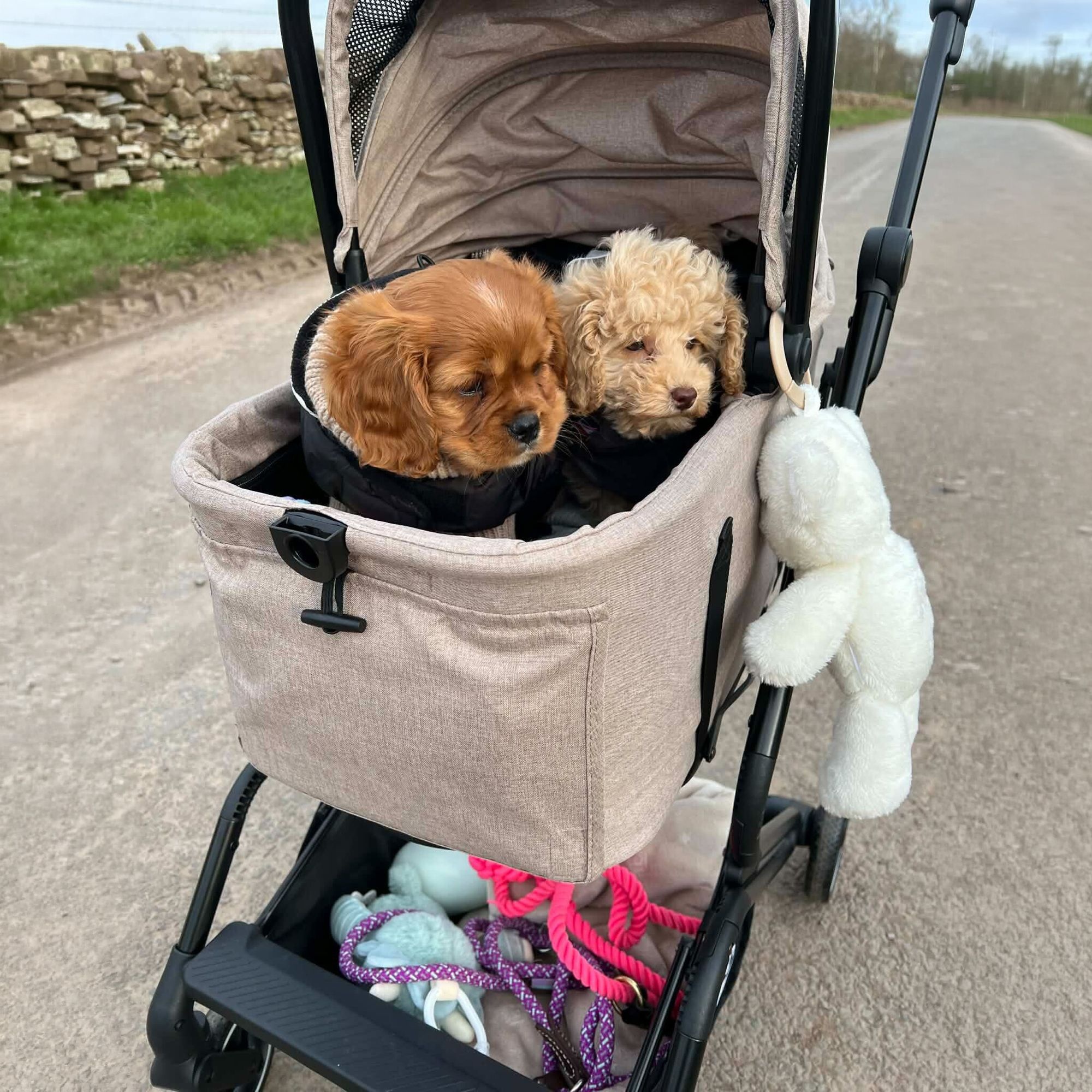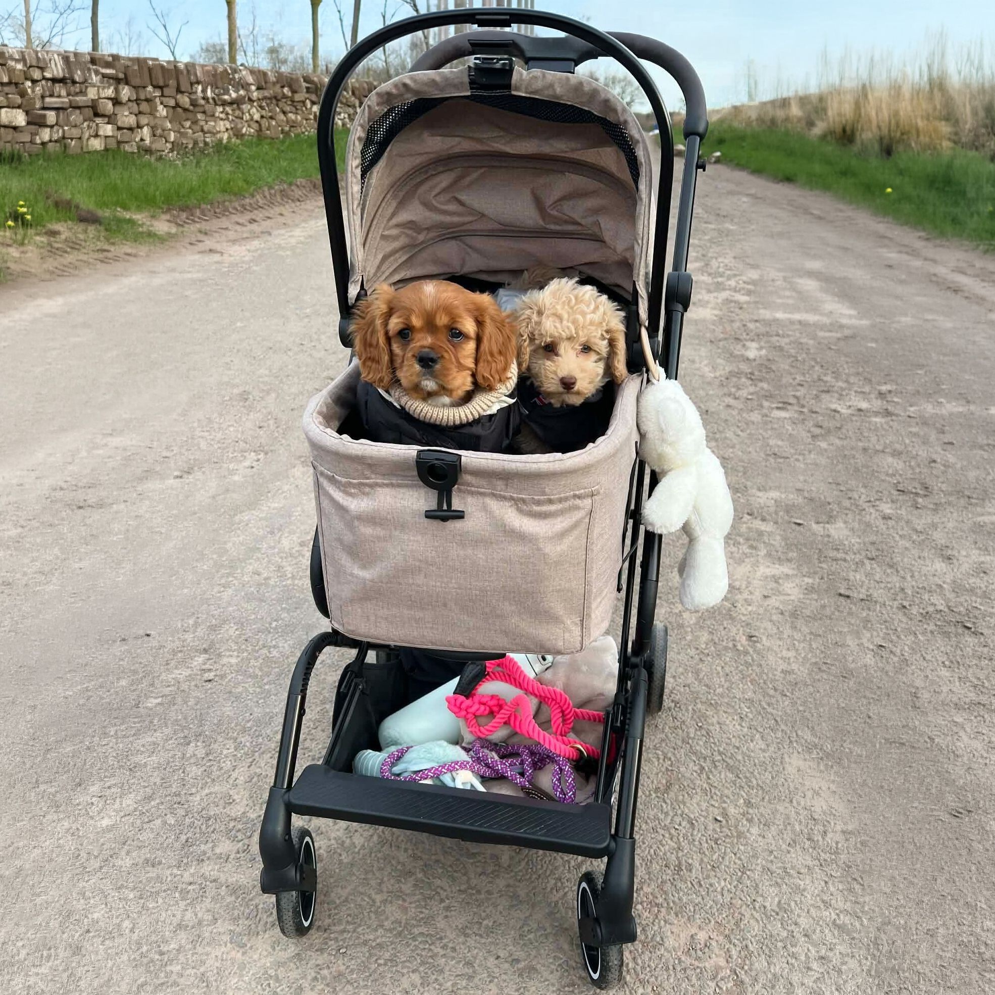 The two internal leads attach to the dog’s harness keeping them secure in the pram.