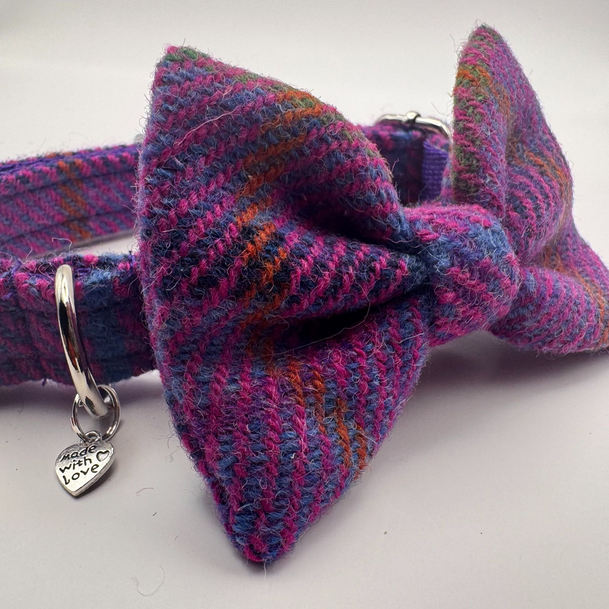 Channel Scotland’s rich heritage with a purple check Jura Harris Tweed bow tie dog collar.