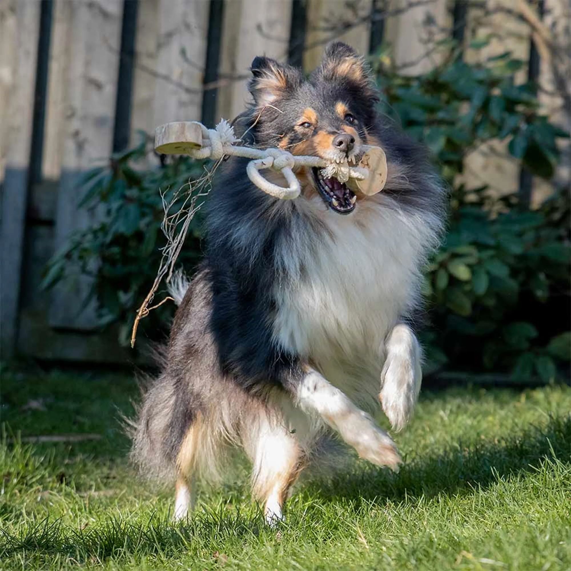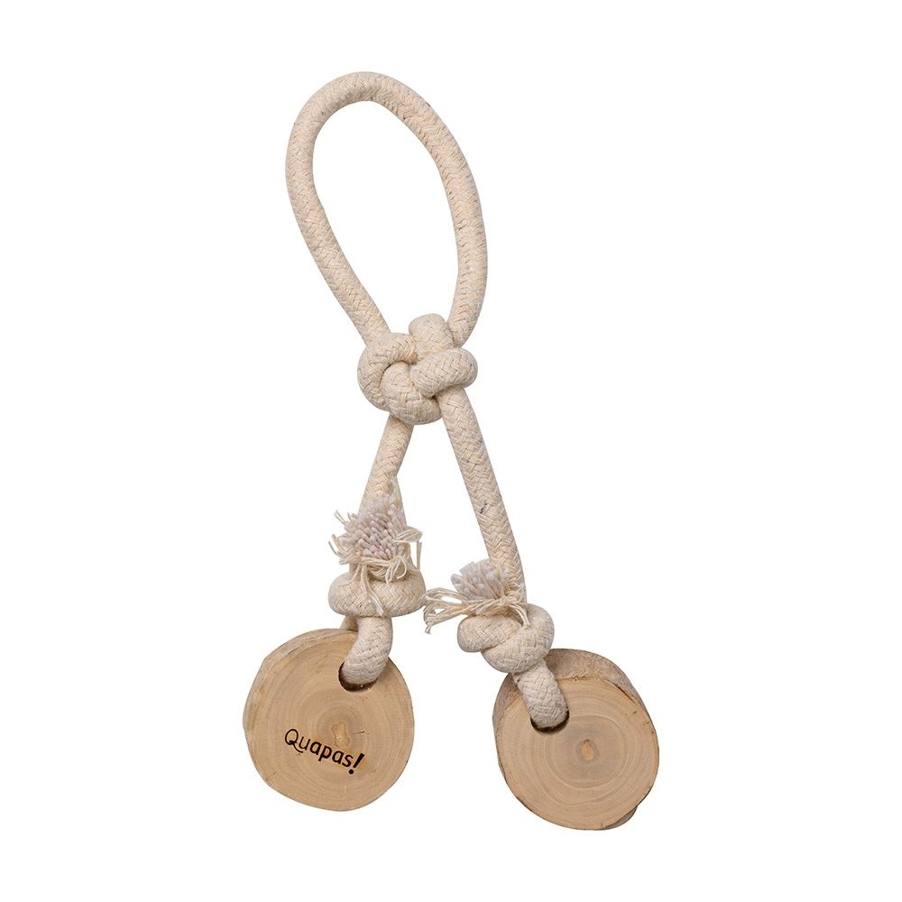 Tug, fetch and chew with a Quapas coffee wood tug rope dog toy. This sustainable dog toy brings together natural coffee wood discs and a thick cotton rope for interactive play and champion chew sessions. Dense coffee wood discs are safe for chewing and the rope has a looped end perfect for games of tug with a favourite pawrent or even the spare human. This tug rope dog toy creates playful moments to help your dog lead a fun and active life.