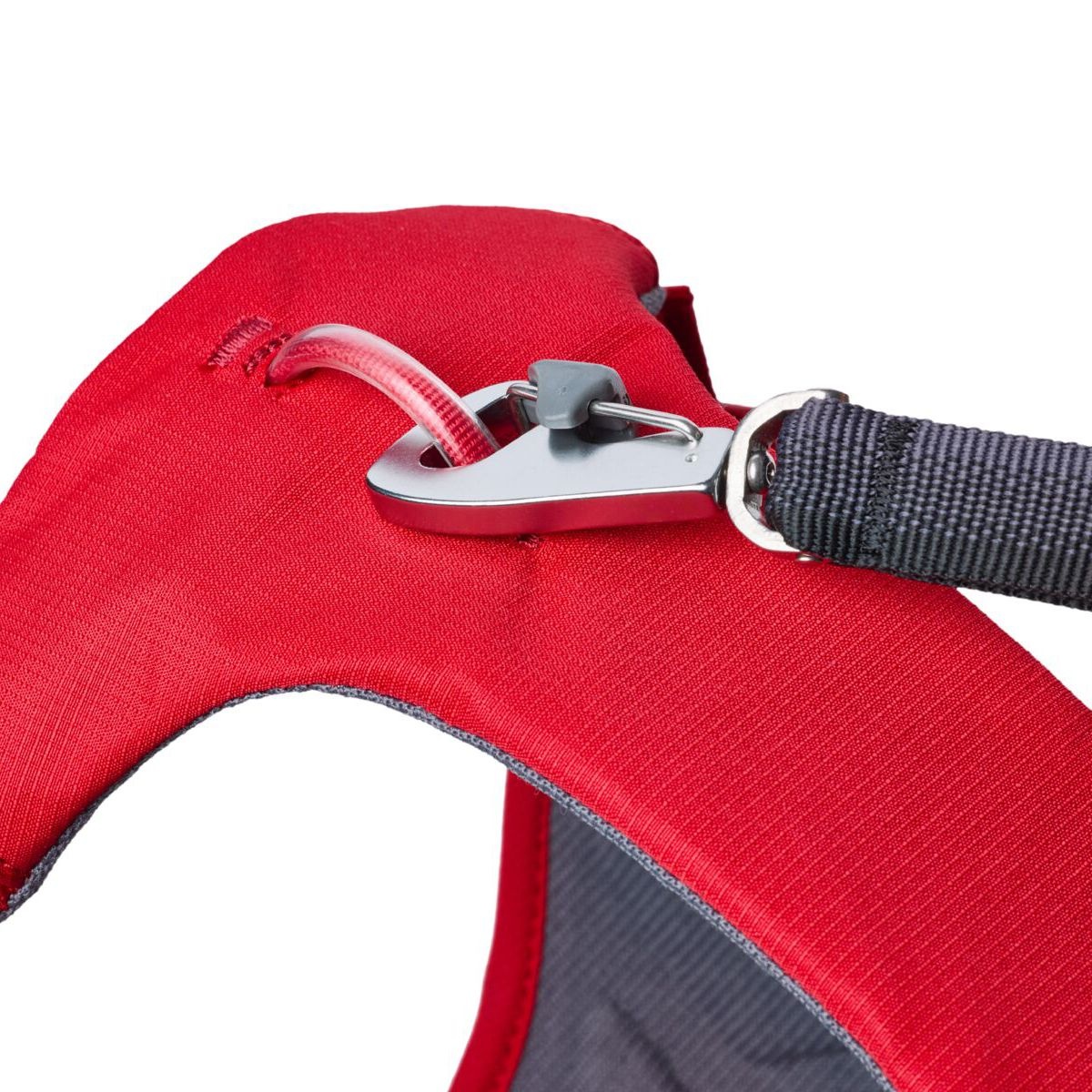 Strong aluminium V-ring and webbing loop on the back for secure lead attachment.